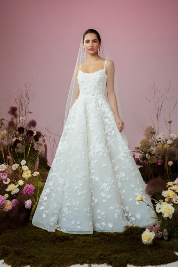 Structured ballerina ballgown with tiered crinoline underskirt of allover 3D textured embroidered lace.