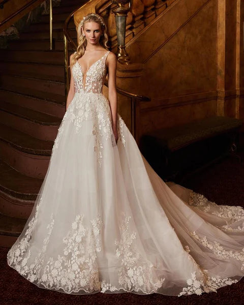 When designing this showstopper, we put our heads down so we could find the most perfect, delicate floral lace that would complement, and not overpower, this graceful ball gown wedding dress.