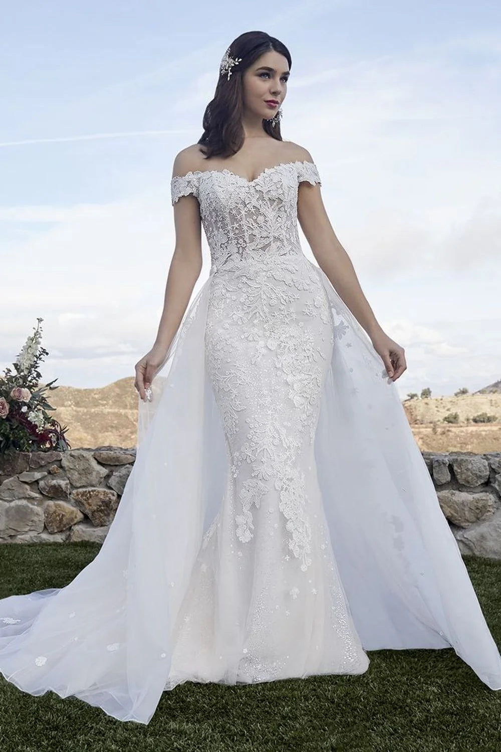 Beach wedding dress glam rises to a whole new level of beauty with Style 2419 McKenzie by Casablanca Bridal. Beaded lace appliques take shape as subtle stars and flowing botanicals, sitting delicately atop sequined tulle that catches the sunlight at every angle