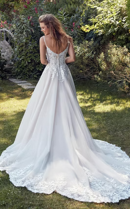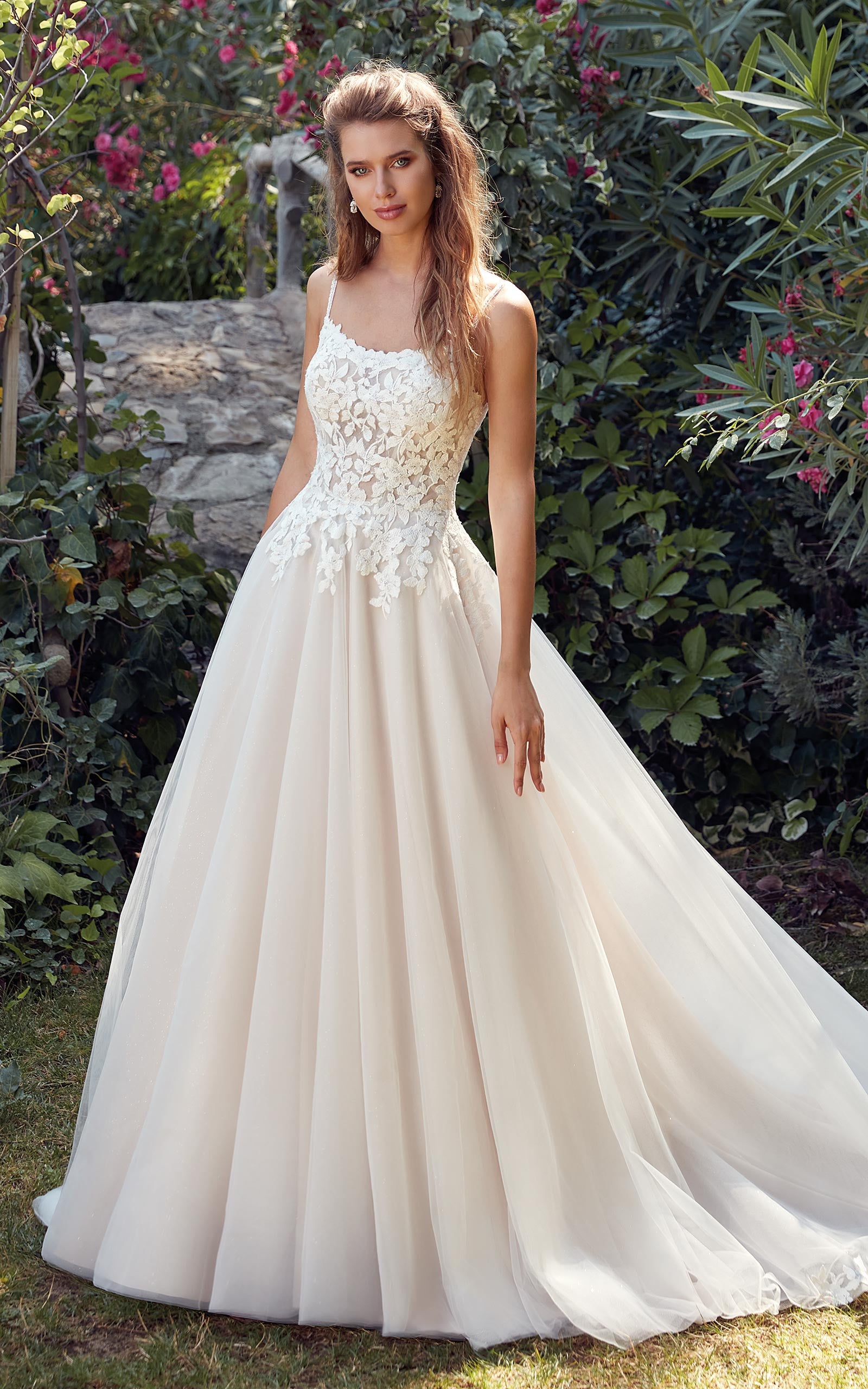 Daphne is a romantic square-neck ballgown featuring an intricately crafted lace bodice that flows into a soft, airy tulle skirt. Finished with a beautifully detailed train, this gown blends timeless elegance with delicate femininity for a truly captivating bridal look.