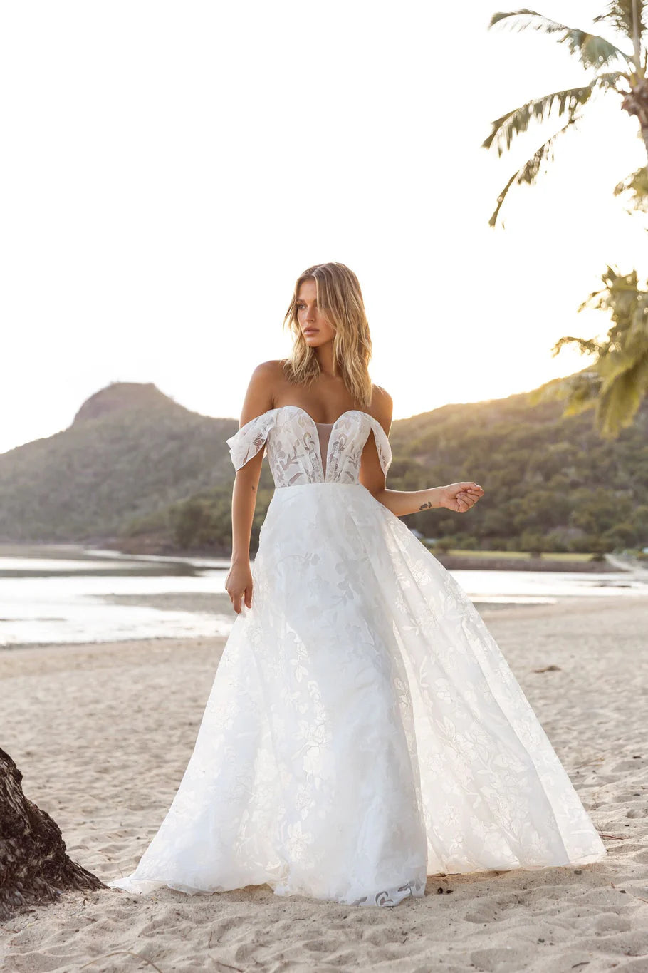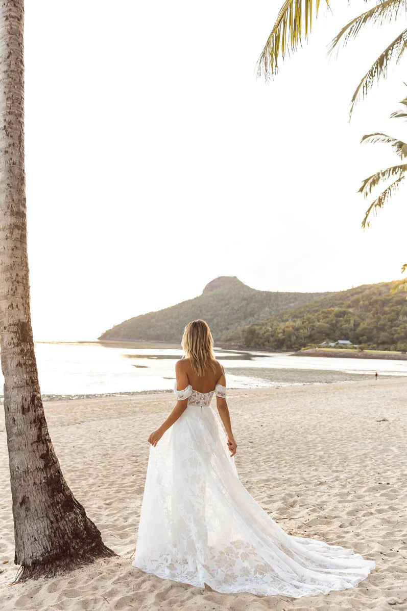 Joslin is the modern embodiment of the oasis dream. Carefree and sweet just like her sweetheart neckline and strapless semi-illusion bodice finished with diagonal pleats which visually draws the bride's waist in. She is joyous in the way she moves as her ever-popular A-line silhouette sweeps around with her semi-illusion train. As she turns and pirouettes with her gown through the wind, her laser cut chiffon design on her tulle metallic fabric highlights the glitter tulle underlay of her gown. Fall in love with every detail of Joslin including her detachable off shoulder pleated straps for that defined look.Â