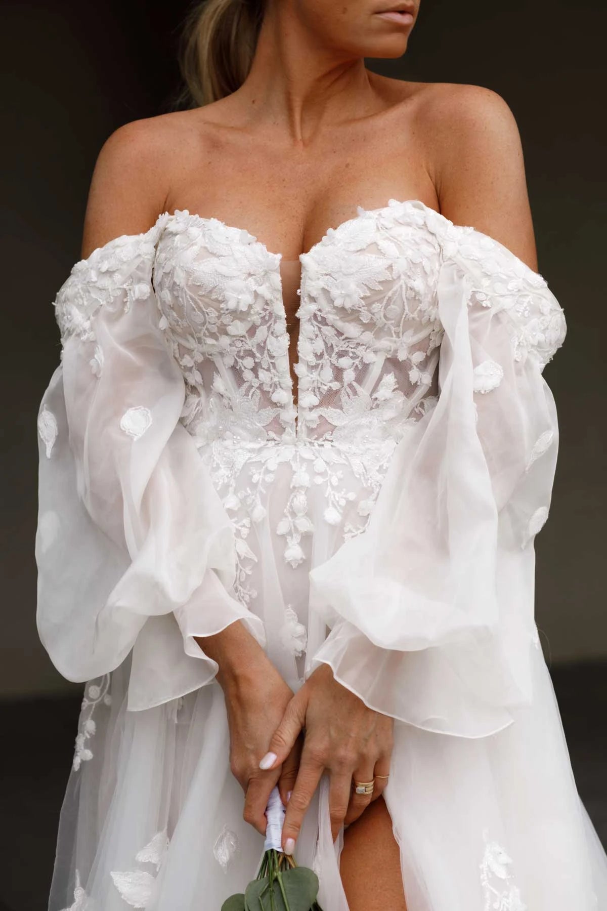 Ethereal and romantic, Style 1593 is impeccably constructed in dreamy sheer tulle and delicate 3D floral lace adorned with subtle beading and pearl detail. Detachable off-the-shoulder blouson sleeves frame the strapless sweetheart bodice with a subtle plunging neckline to highlight the flawless corset fit underneath.