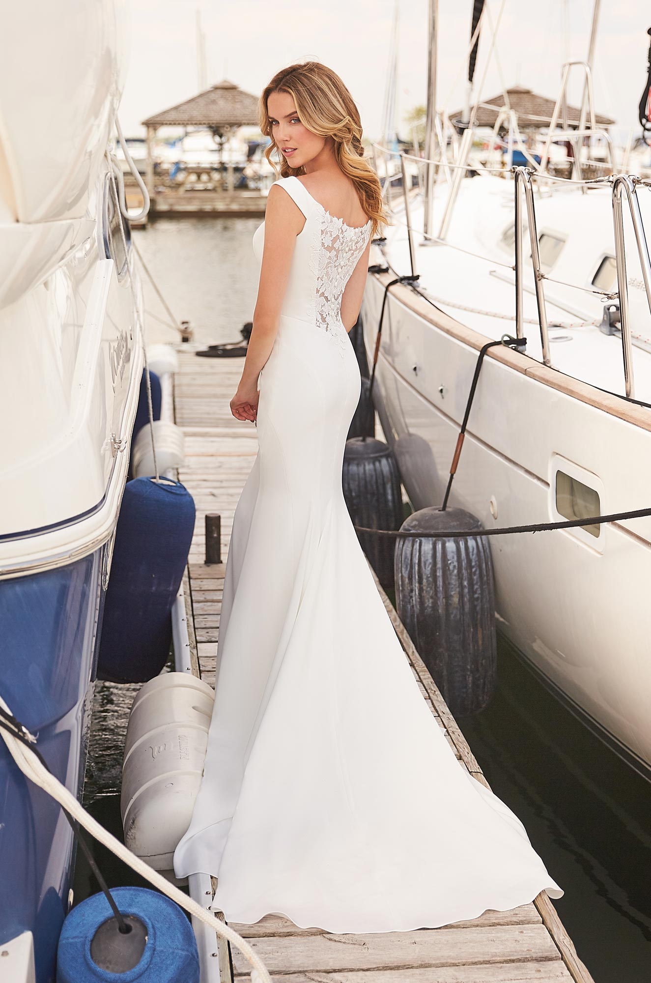 Crêpe and Guipure Lace Wedding Dress. Crêpe off the shoulder gown. Illusion Guipure Lace back with fabric covered buttons. Fit and flare Crêpe skirt with multiple shaped seams for exceptional fit.