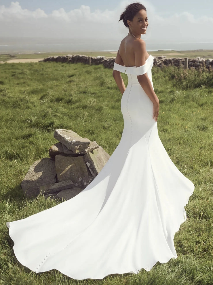 Rebecca Ingram Moriah is a crepe, fit-and-flare with plunging sweetheart neckline and off the shoulder cap sleeves. Moriah adds the perfect amount of detail with the dainty crepe belt with waist-bow and crepe-covered eternity buttons to ensure your wedding photos are perfection.
