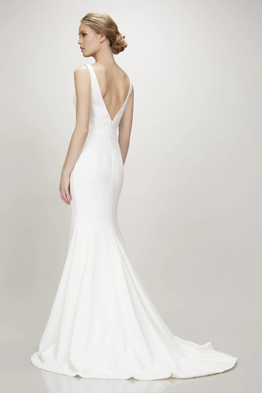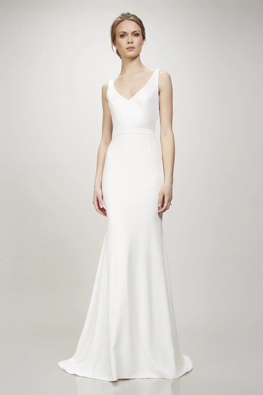Description: Undeniably timeless, the Theia Marissa wedding gown has a v-neck satin bodice has a natural sheer that takes center stage. Combined with a flared skirt, fitted at the waist in stretch crepe which streamlines the natural curves of your silhouette while creating an impactful statement.