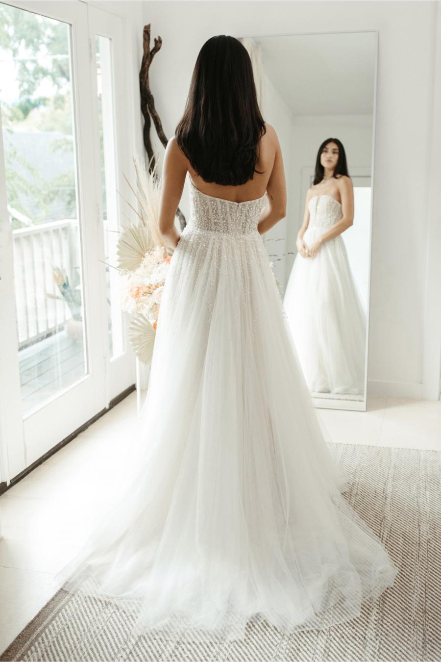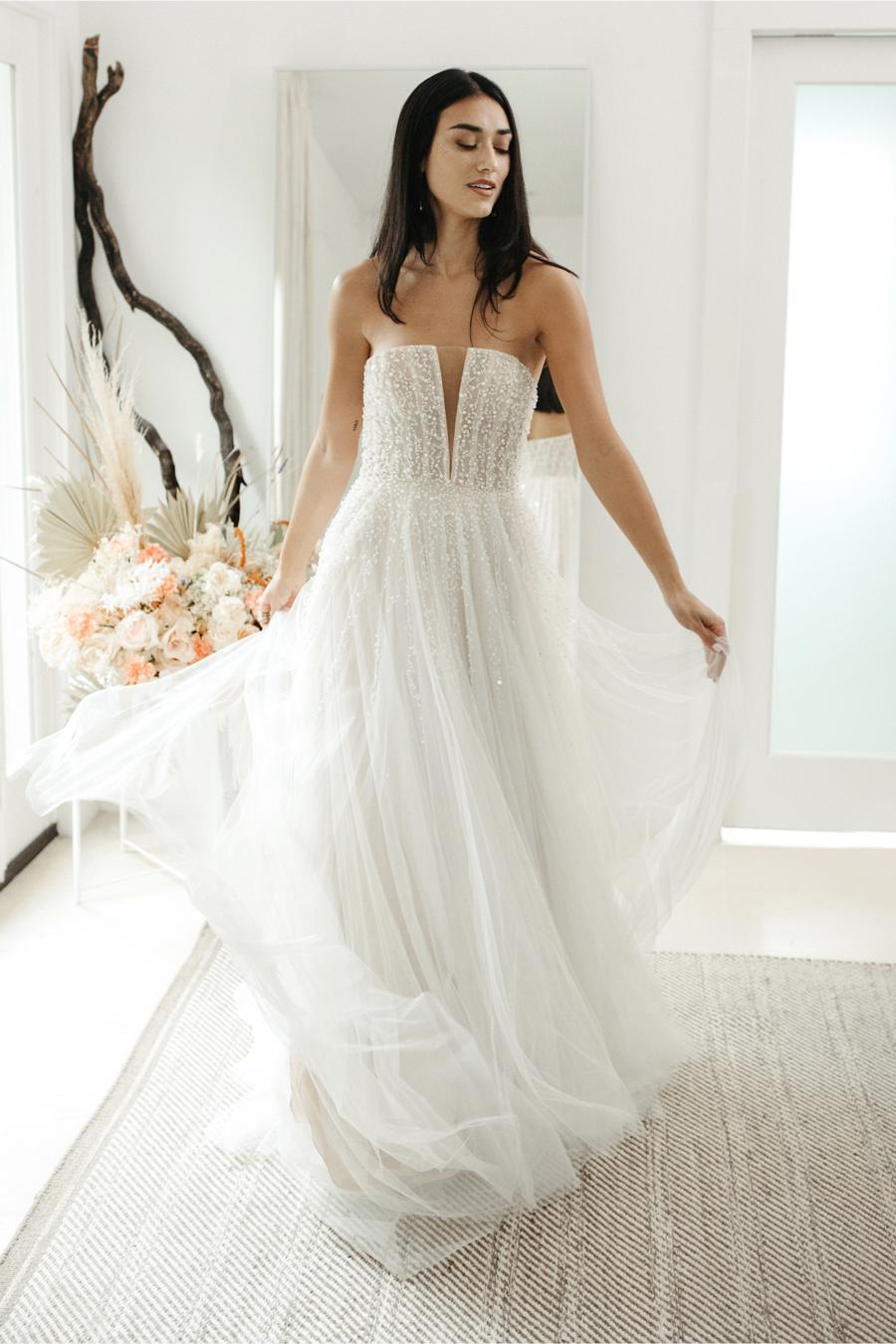 Aeryn is constructed from ombréd custom pearl and crystal beading, a fully corseted bodice with exposed boning, and a flattering illusion panel in the strapless neckline. Her voluminous, tonal layered skirt juxtaposes her structured top for a truly effortless, boho-glam look.