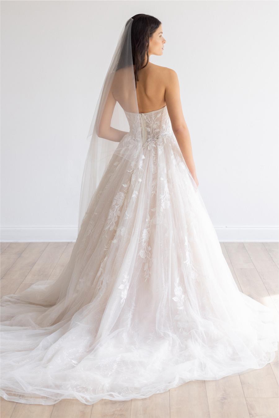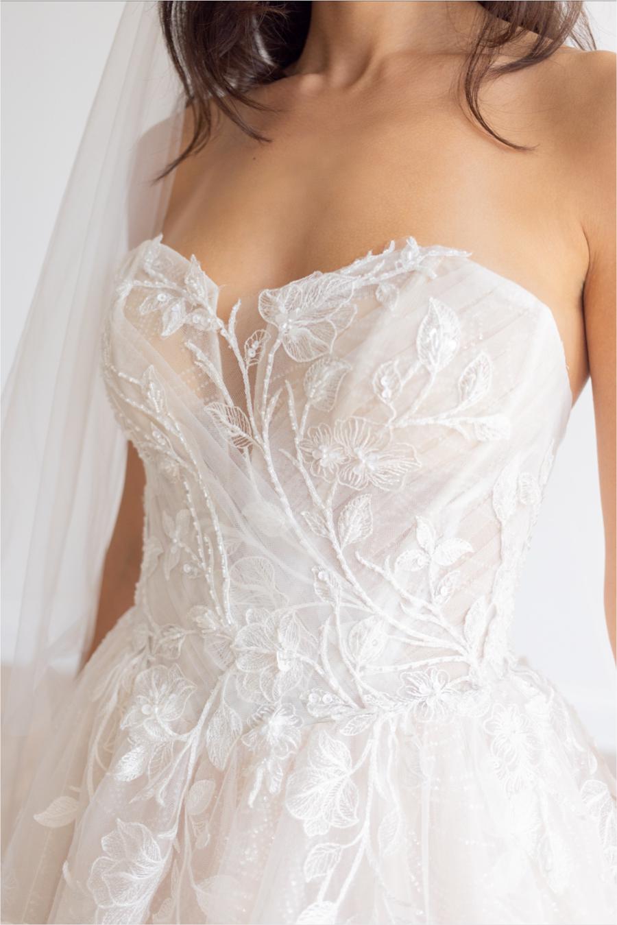 Soft and delicate, Collette is a renaissance of romance; this strapless ballgown boasts idyllic details that create a picturesque study in elegance. The soft twinkle of the beadwork will have you shining your brightest.