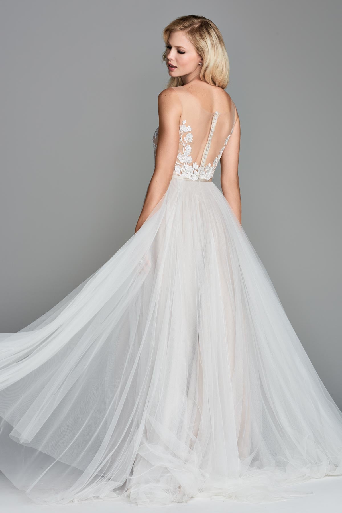 Juno's deep V-neck illusion bodice is covered in a floral lace motif, complete with an option of functional covered buttons or a zipper with non-functional covered buttons in the back. An A-line skirt composed with layers of Soft Netting finishes off this romantic gown.