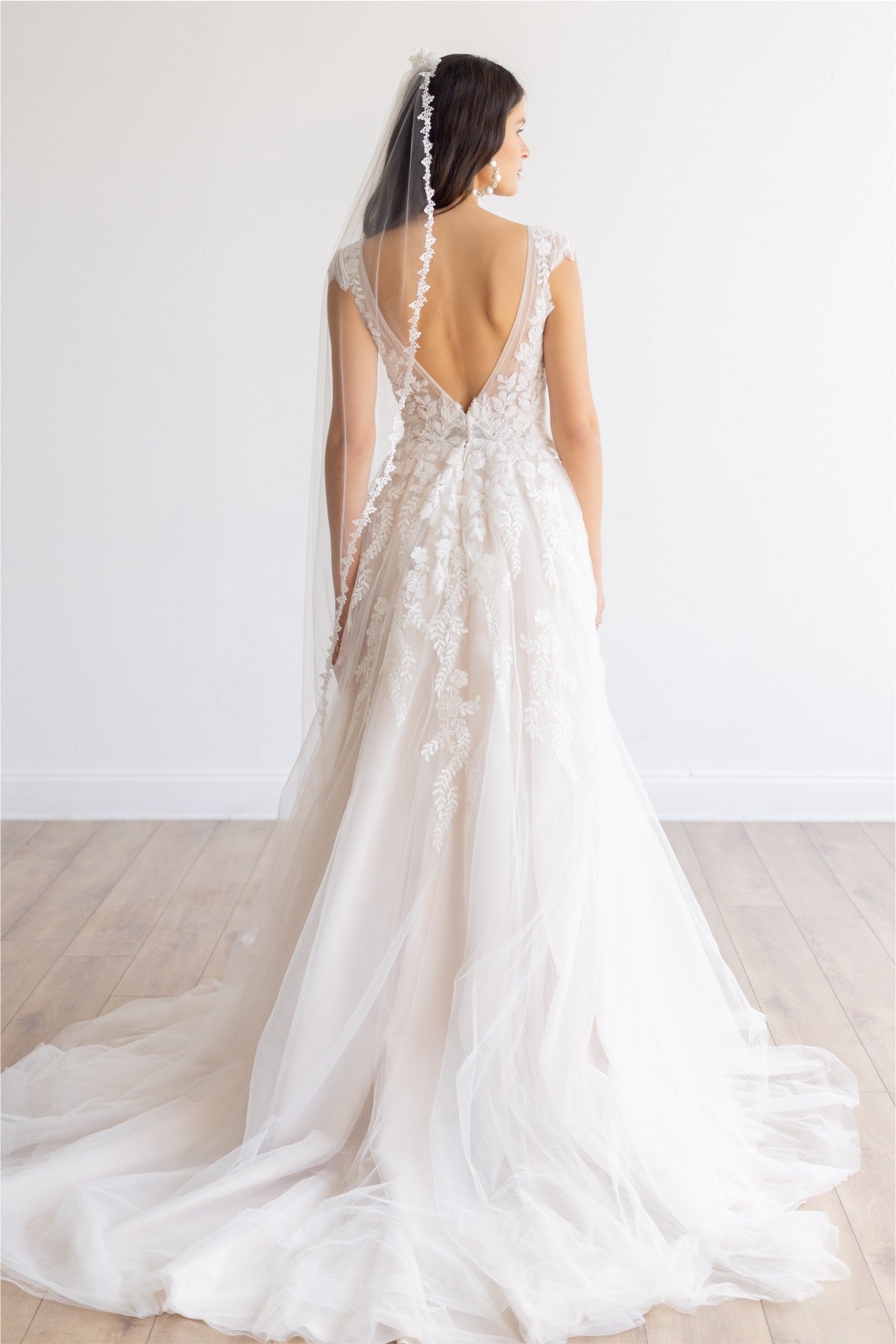 An ethereal vision of romance and class, Lisle offers a plunging neckline and hand-placed Bodhi Leaf motifs fit for a princess. This A-line gown floats effortlessly about the floor, certain to steal the air out of any room.