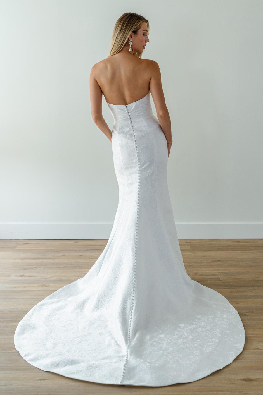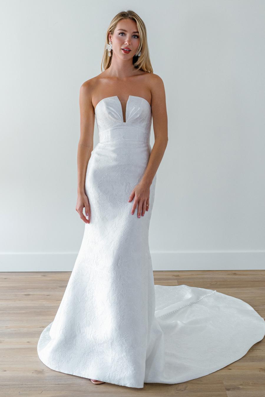 WTOO Noor is a stunning jacquard sheath wedding dress featuring detached long sleeves with bow accents!