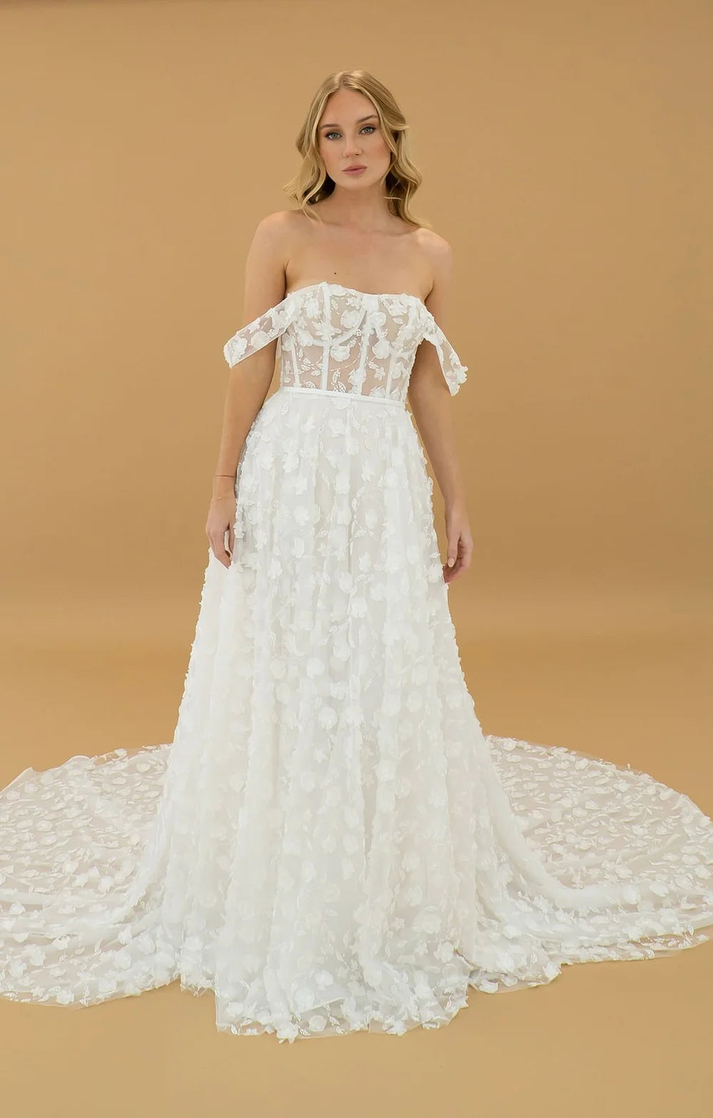A stunning off-the-shoulder wedding gown featuring a structured bodice, 3D floral lace, and an a-line skirt.